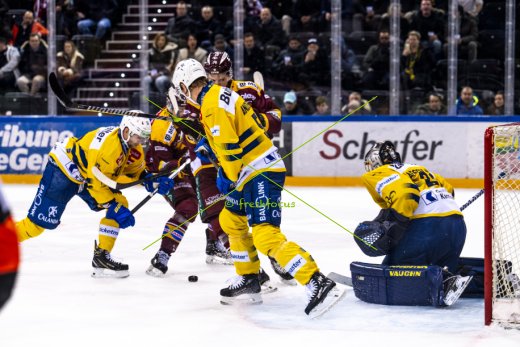 05.12.2024; Genf; Eishockey National League - Genf-Servette HC - HC Davos; Sven Jung (Davos) Calle Anderson (Davos) Marc-Antoine Pouliot (Genf) Torhueter Sandro Aeschlimann (Davos) (Laurent Daspres/Freshfocus)