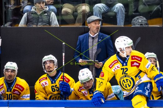 05.12.2024; Genf; Eishockey National League - Genf-Servette HC - HC Davos; Andres Ambuehl (Davos) Marc Wieser (Davos) Julian Parree (Davos) Assistenztrainer Glen Metropolit (Davos) Tino Kessler (Davos) (Laurent Daspres/Freshfocus)