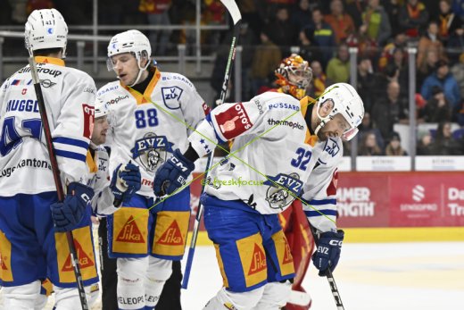 07.12.2024; Langnau; Eishockey National League - SCL Tigers - EV Zug; Lukas Bengtsson (r, Zug) nach dem Tor zum 1:4 mit Leon Muggli (Zug) Lino Martschini (Zug) Sven Senteler (Zug) (Urs Lindt/freshfocus)