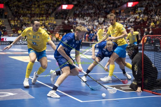 15.12.2024; Malmoe; Unihockey WM 2024 - Finale - Schweden - Finnland, Heikki Iiskola (FIN) und Otto Lehkosuo (FIN) gegen Robin Nilsberth (SWE) Tobias Gustafsson (SWE) und Torhueter Jon Hedlund (SWE) (Claudio Thoma/freshfocus)