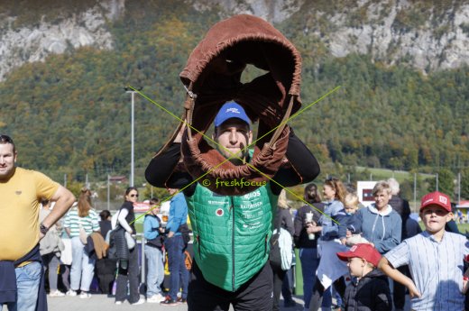 11.10.2025; Mels; Schwingen - Schwinger-Fussballturnier; Schwingerkoenig Armon Orlik macht fuer einen guten Zweck bei einem Geschicklichkeitsspiel mit, bei dem man eine Schwingerhose an ein Brett mit Haken werfen muss. (Sven Thomann/Blick/freshfocus)