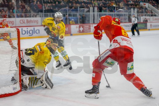 09.02.2019; Biel; Eishockey National League - EHC Biel - SC Bern; Michael Huegli (Biel) gegen Torhueter Leonardo Genoni (Bern) (Estelle Vagne/freshfocus)